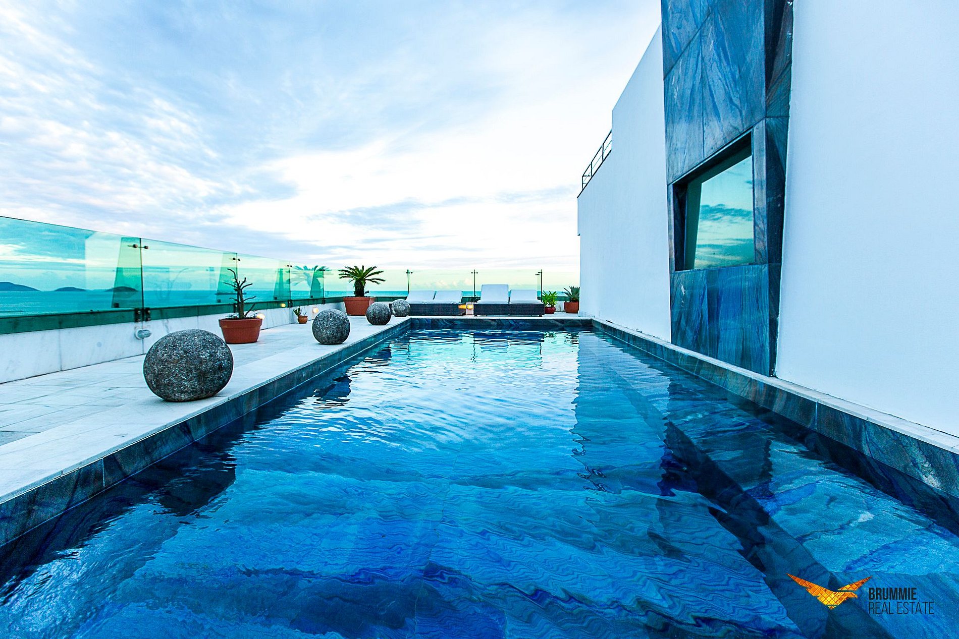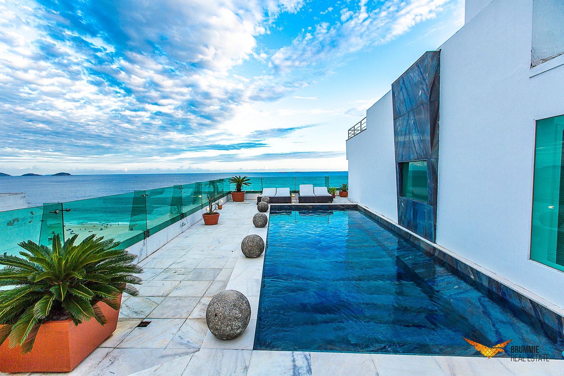 El área exterior es verdaderamente extraordinaria: piscina de mármol azul con cascada, sauna de vidrio con vista abierta, jacuzzi y una vista espectacular de la playa de Copacabana.
