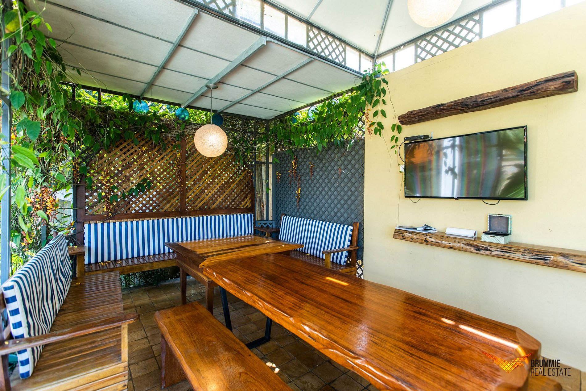 En el exterior, una preciosa piscina con zona poco profunda conectada a la parte más honda está rodeada de un jardín con tumbonas para relajarse y tomar el sol. Al lado, una terraza techada ofrece una zona gourmet con parrilla, encimera y armarios. La sauna húmeda se encuentra junto a la piscina, y hay dos baños exteriores que dan servicio a esta área.