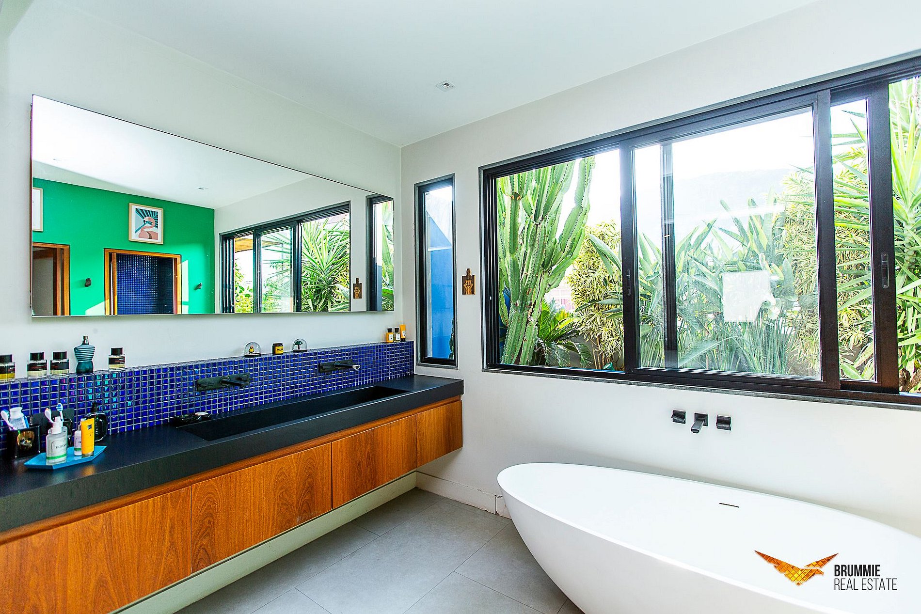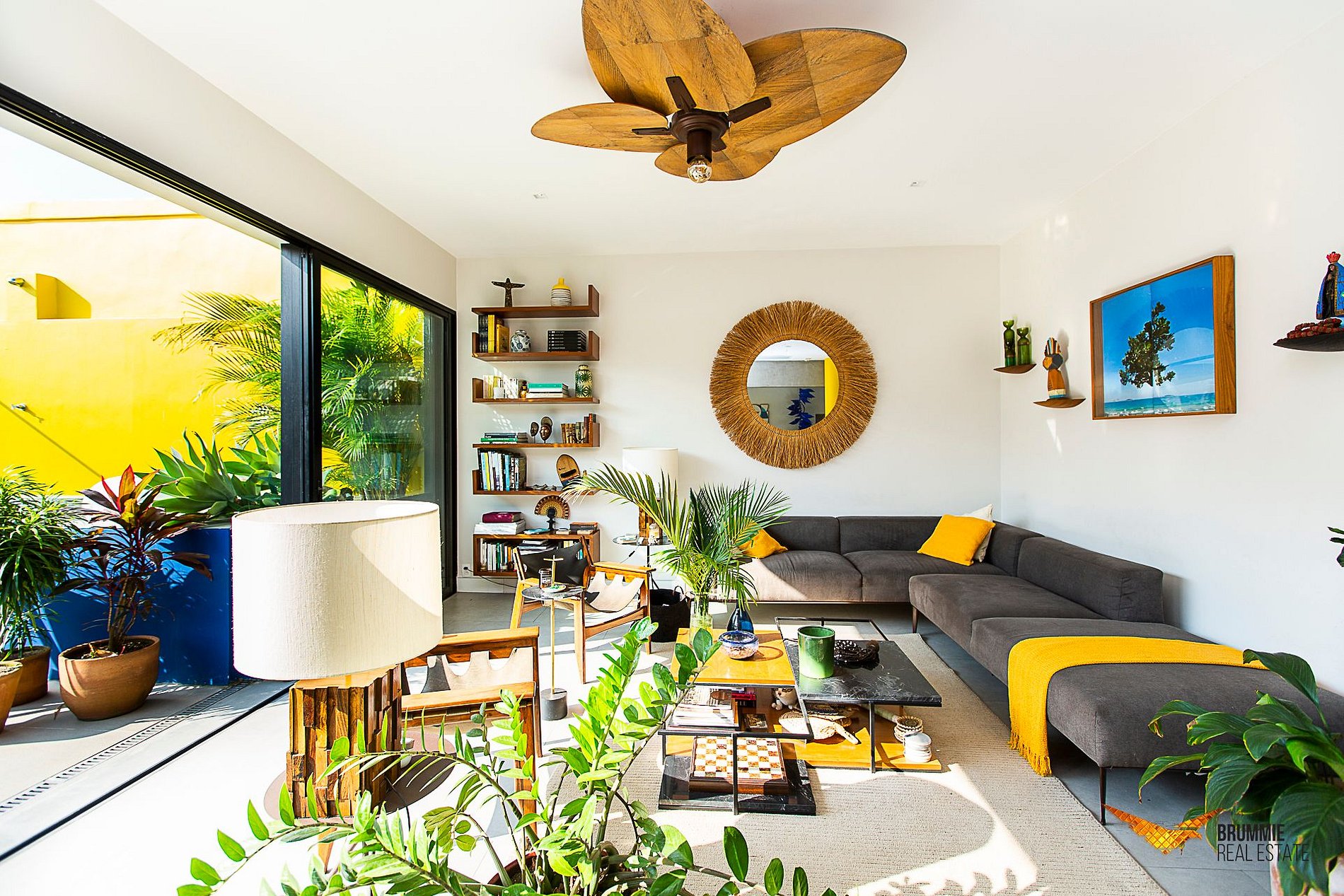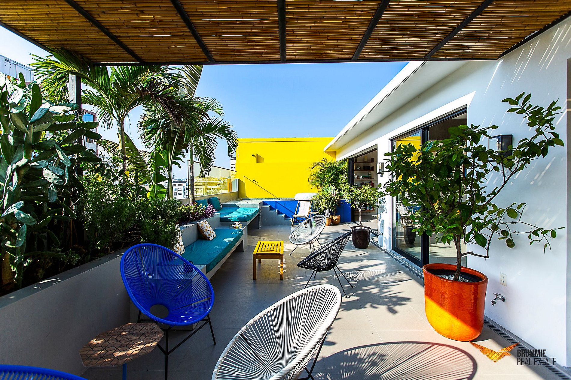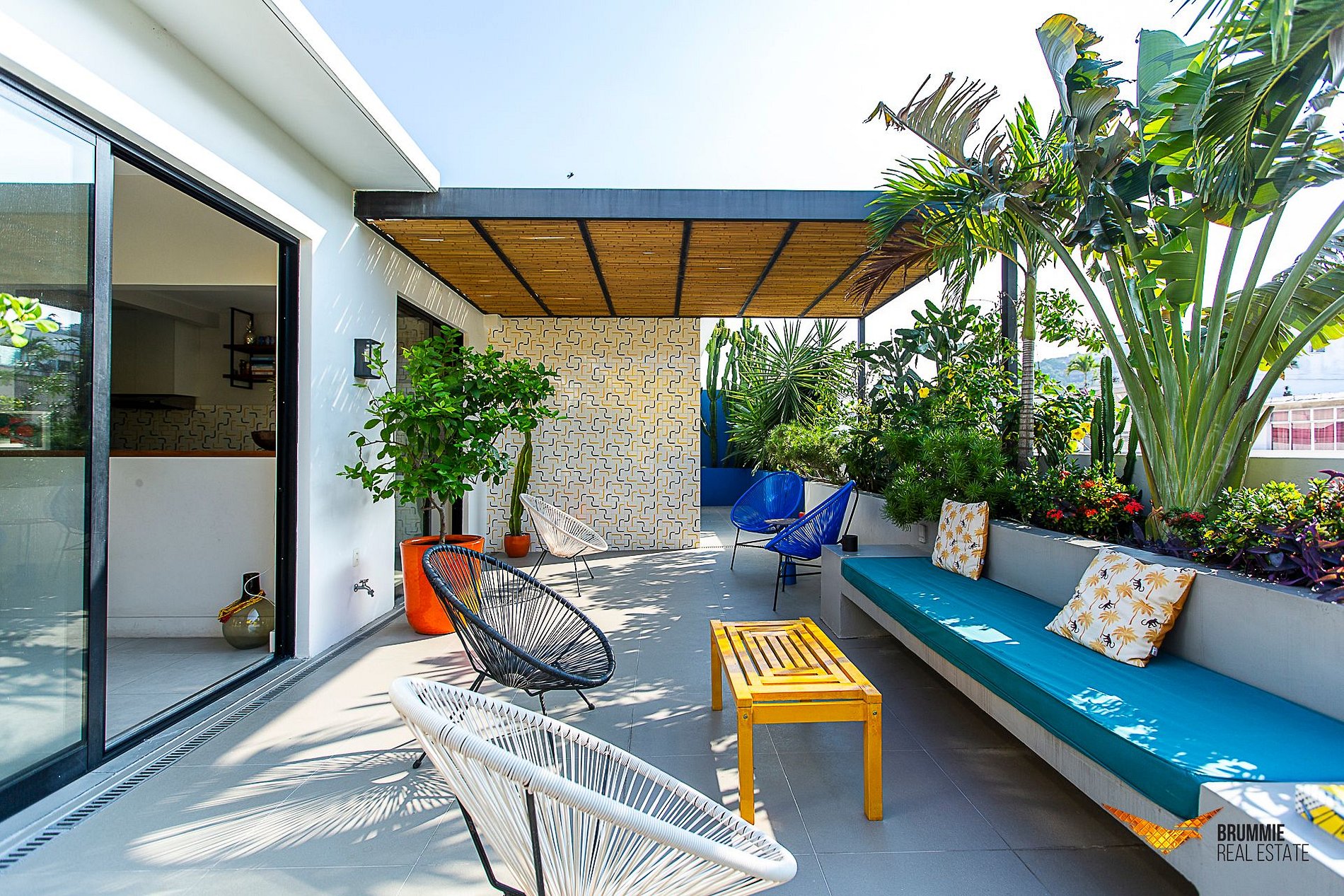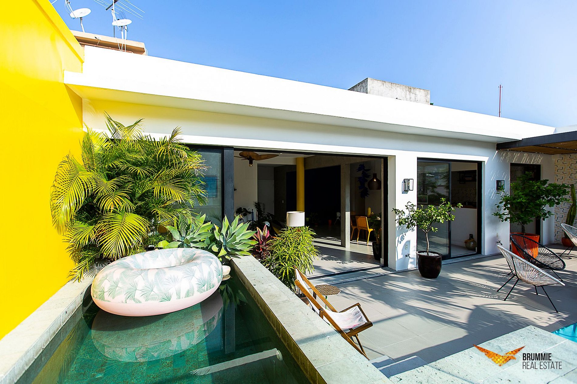 La sala de estar colorida se conecta naturalmente con la terraza y la piscina. La cocina está totalmente equipada para disfrutar de las comidas en casa. Cuenta con tres dormitorios cómodos: una suite con cama king-size, uno con cama queen y otro con cama individual.