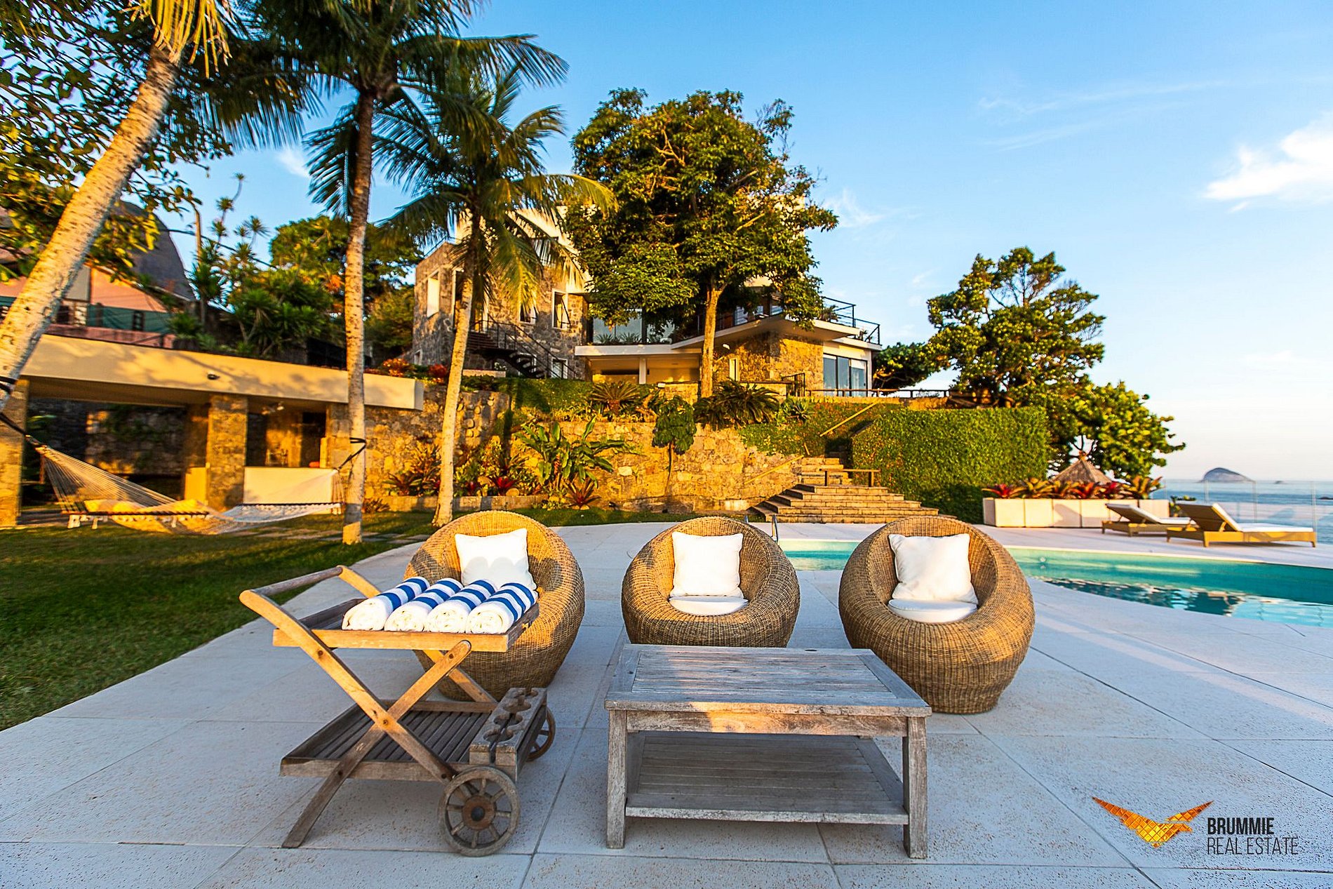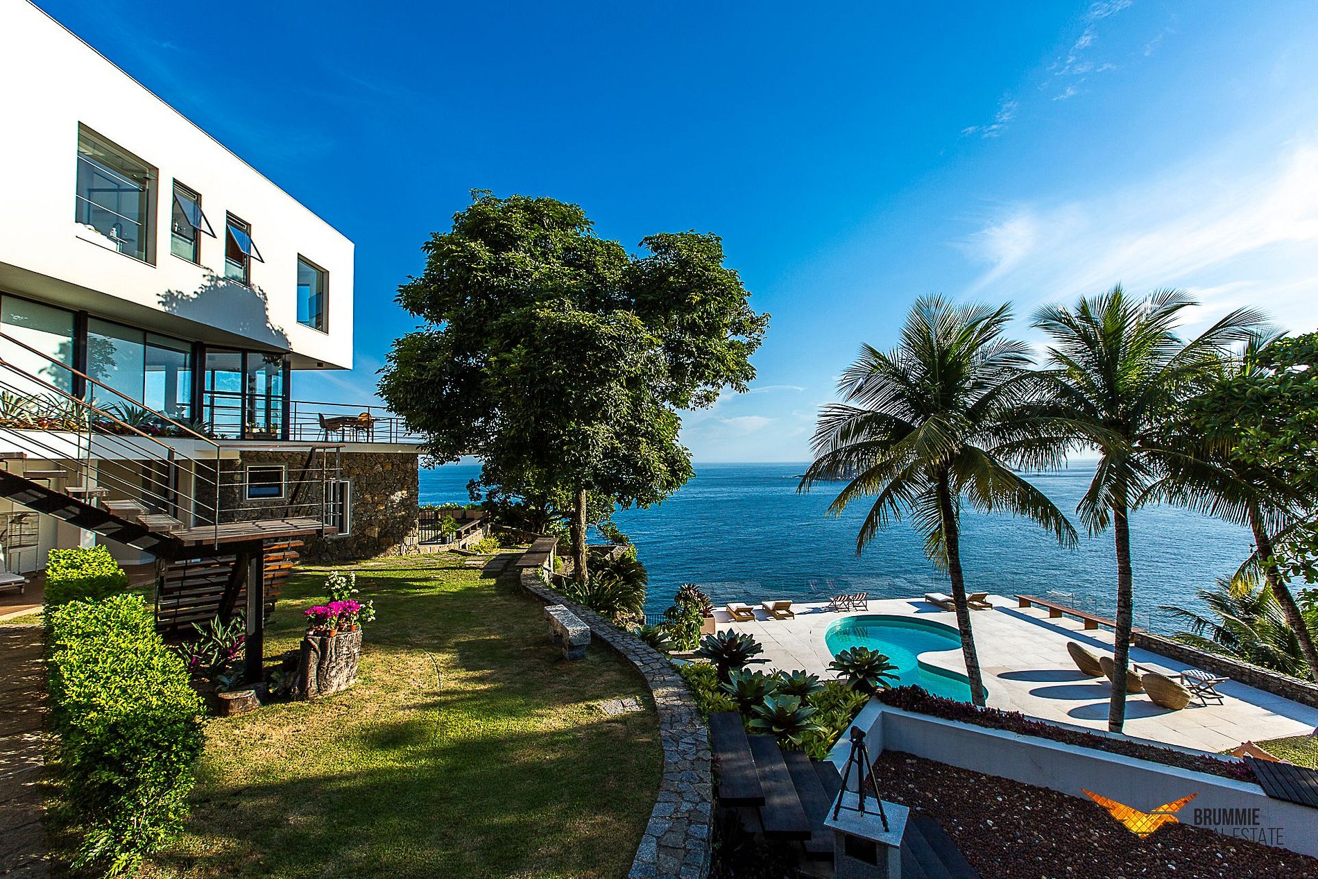 Esta deslumbrante mansão oferece três suítes com camas king-size, vistas panorâmicas sobre o oceano e amenidades sofisticadas. Um quarto adicional pode ser adaptado para casal, e há ainda um loft independente com sala, cozinha, walk-in closet e suíte.