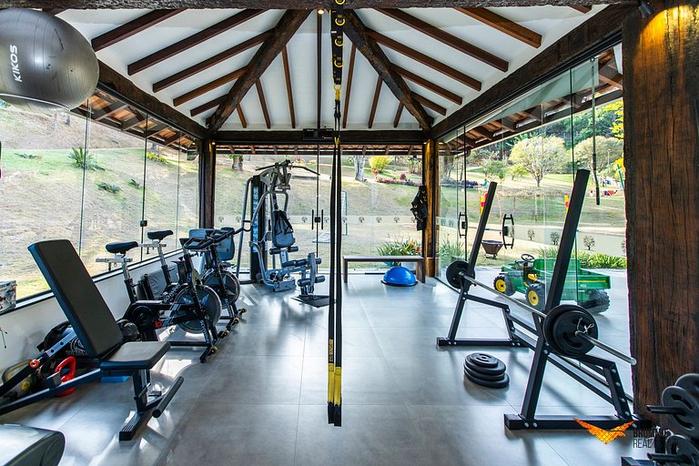 O espaço conta com sala de estar aconchegante, cozinha completa com forno a lenha, área de jogos com ping-pong e academia equipada. As áreas externas oferecem piscina, quadra de tênis, sauna, jacuzzi, hortinha e amplos gramados para lazer ao ar livre.