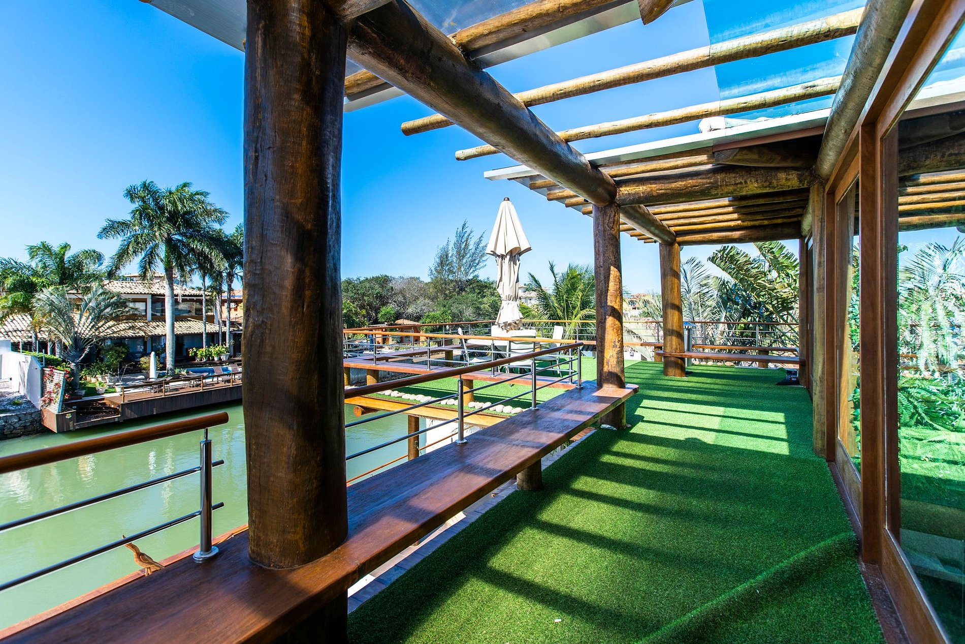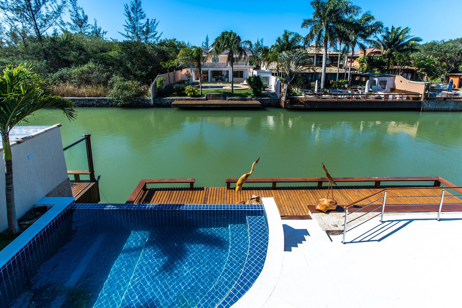 A área externa oferece piscina com deck, espaço gourmet totalmente equipado, sistema de som integrado e um píer privativo no canal — perfeito para dias relaxantes ao ar livre.