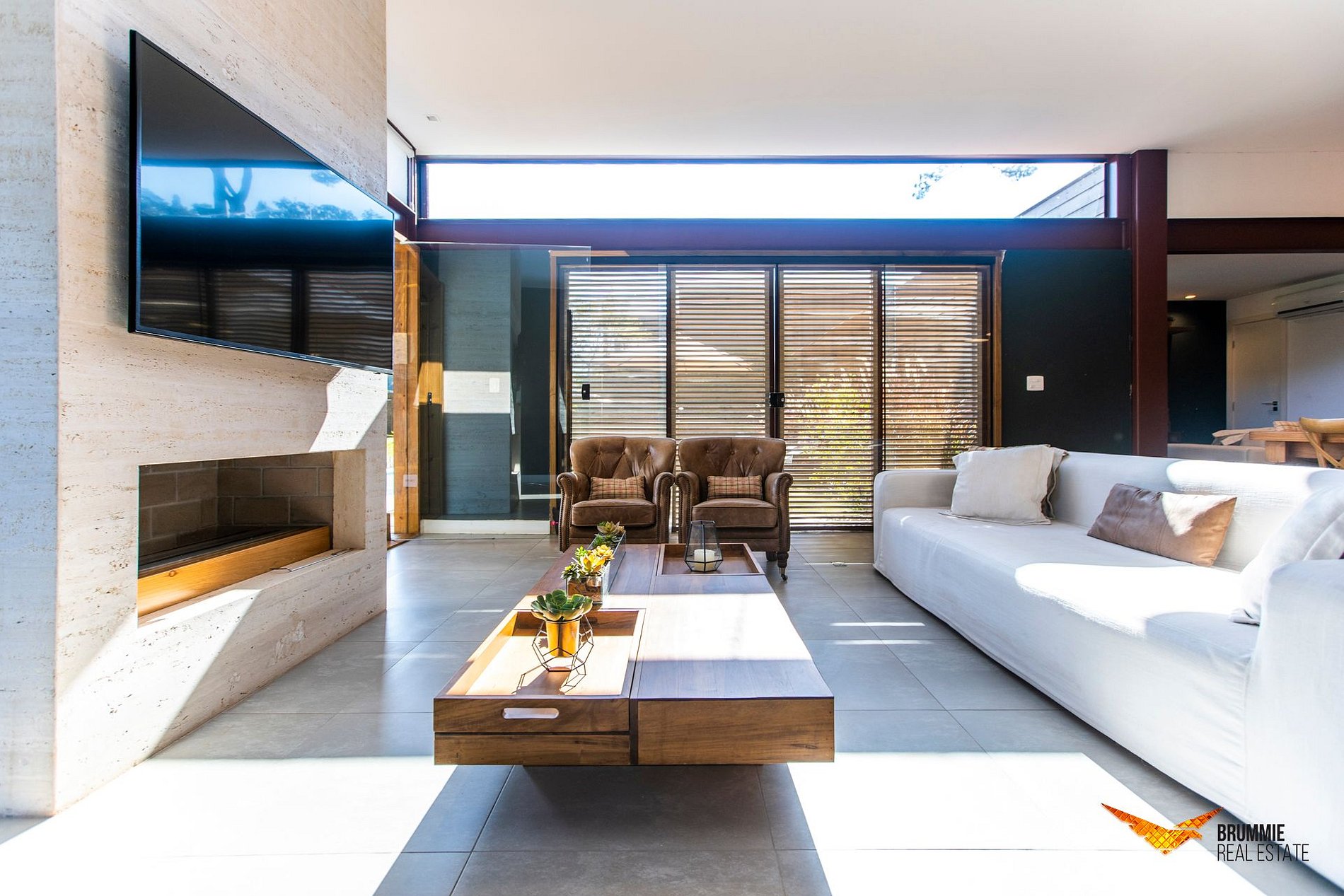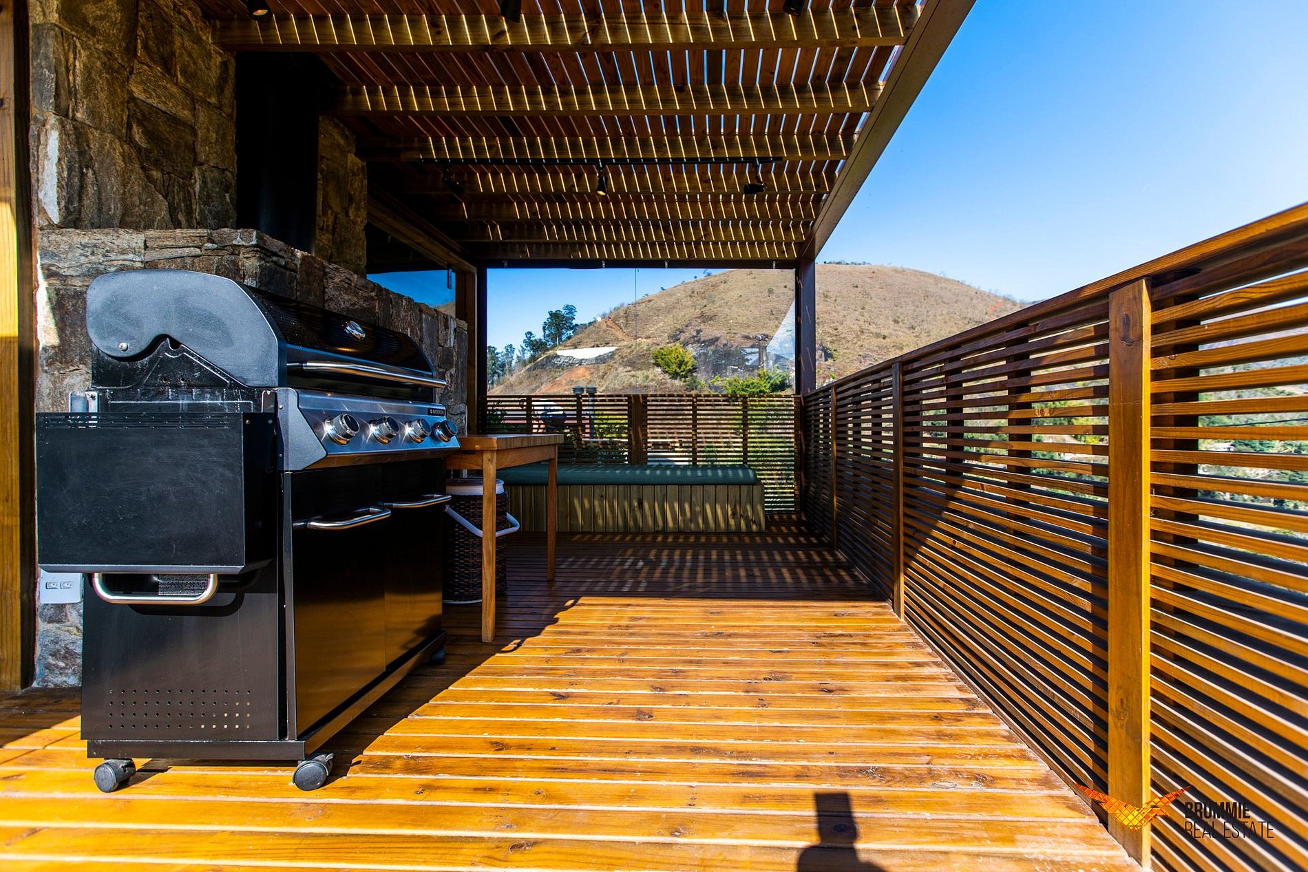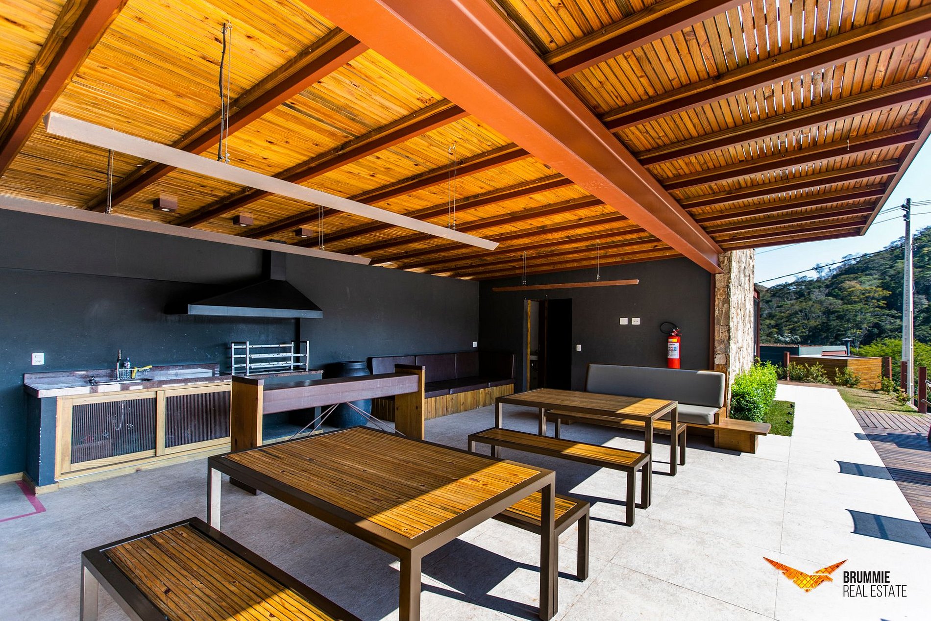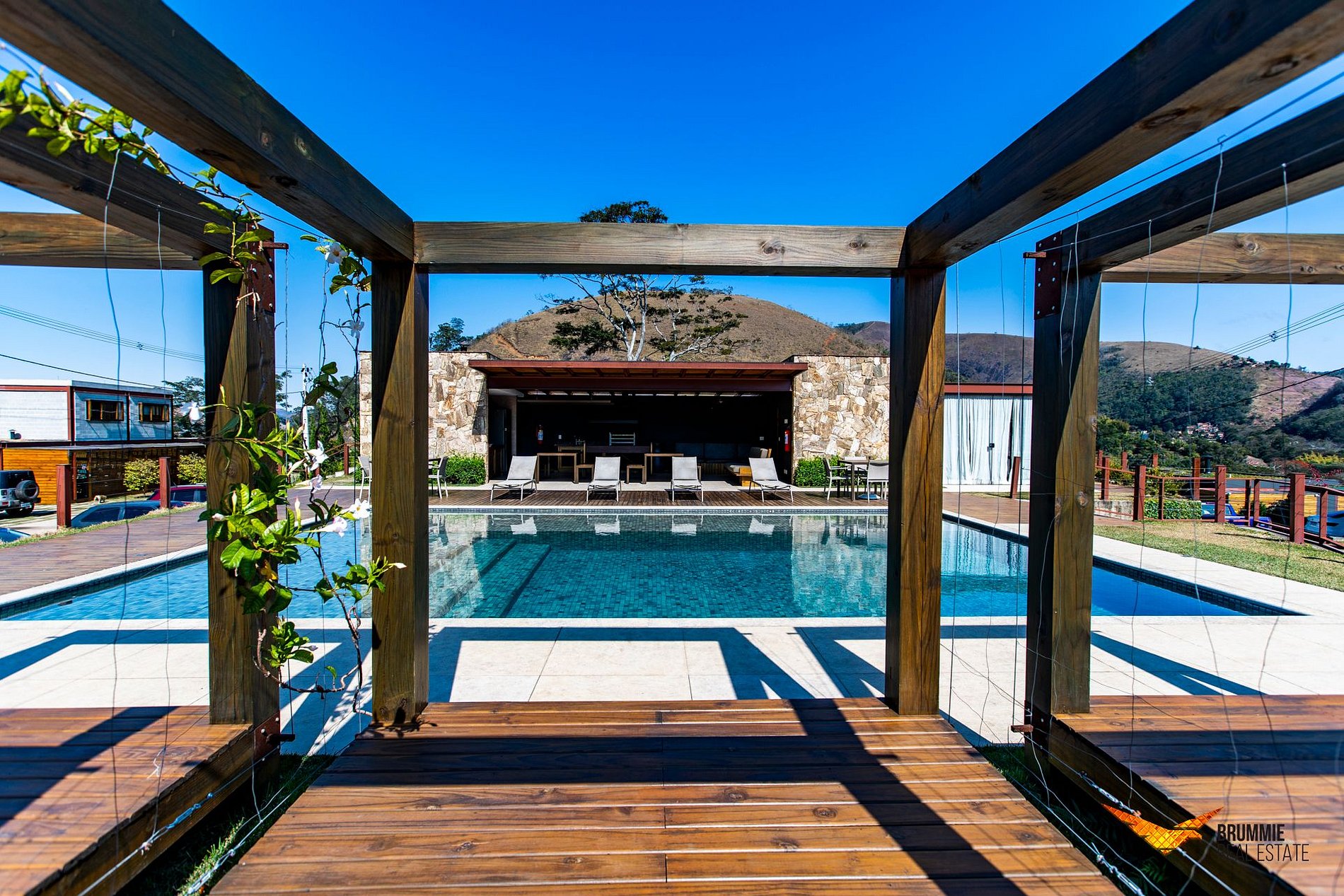 O jardim plano e gramado abriga uma piscina privativa com borda infinita (aquecimento opcional), mesa com 6 cadeiras, sofás e ombrelones para relaxar ao ar livre. A varanda coberta oferece uma charmosa churrasqueira à gás estilo americana e uma lareira externa, enquanto o interior da casa também dispõe de uma aconchegante lareira na sala de estar.