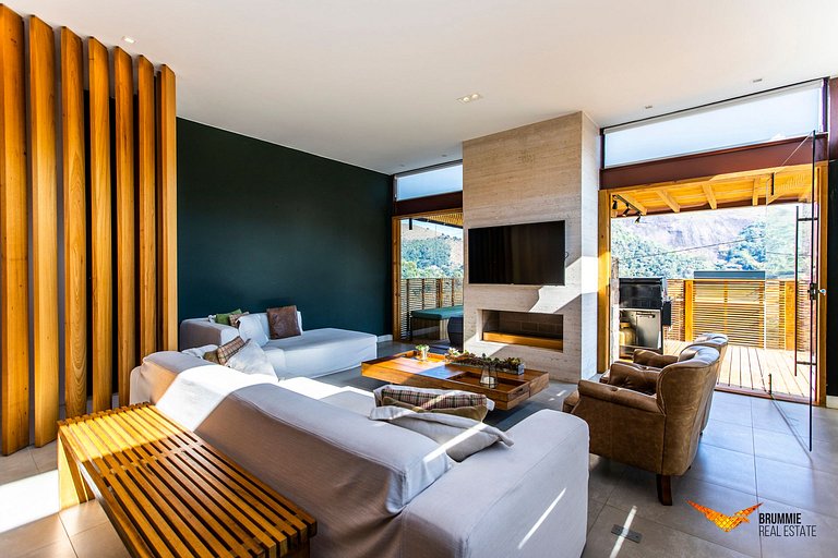 O jardim plano e gramado abriga uma piscina privativa com borda infinita (aquecimento opcional), mesa com 6 cadeiras, sofás e ombrelones para relaxar ao ar livre. A varanda coberta oferece uma charmosa churrasqueira à gás estilo americana e uma lareira externa, enquanto o interior da casa também dispõe de uma aconchegante lareira na sala de estar.