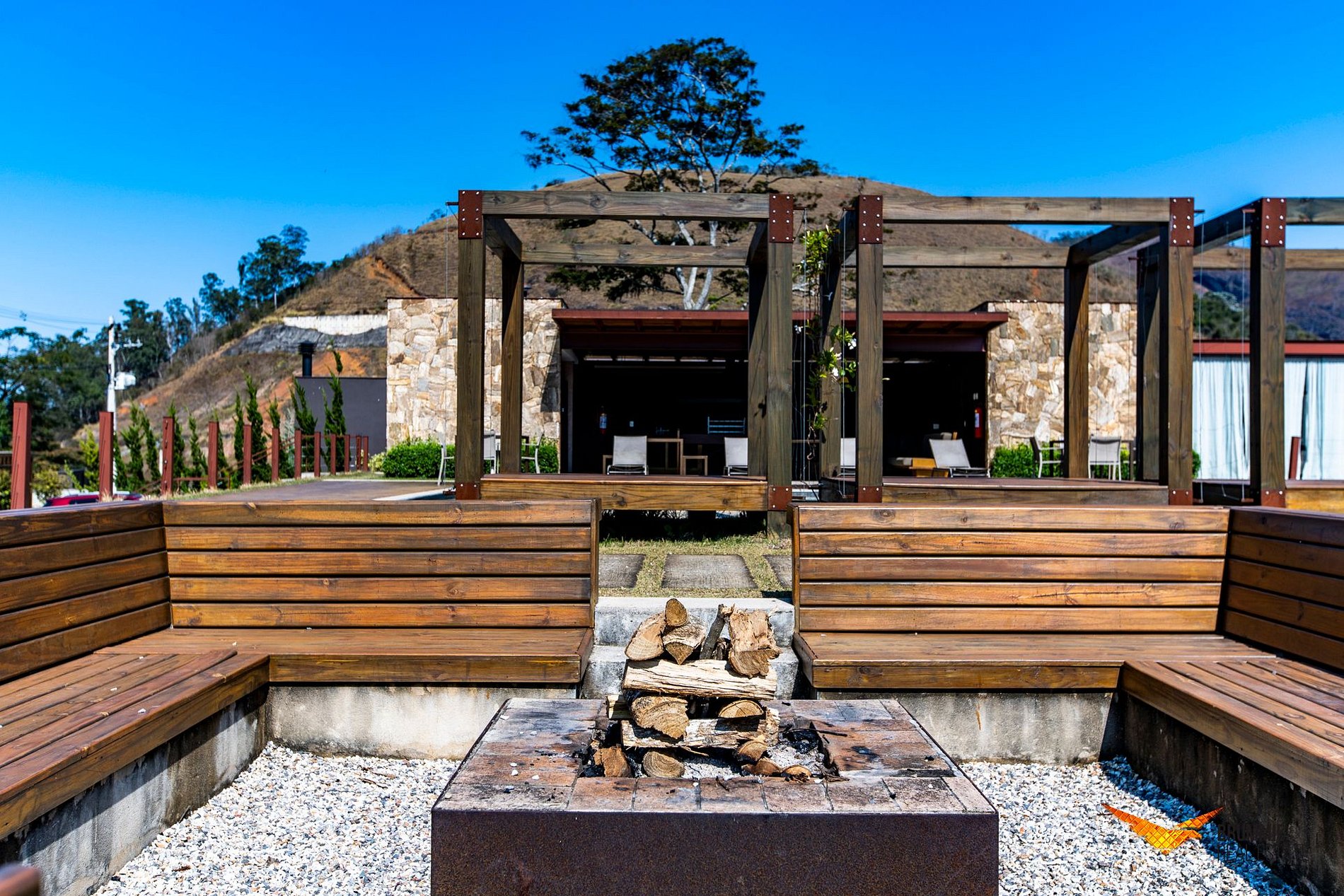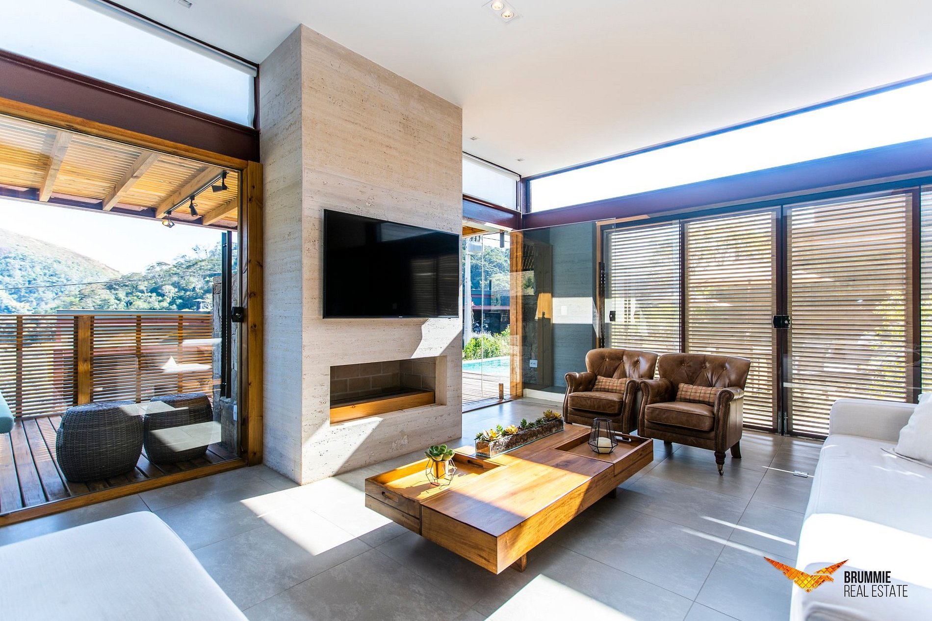 O jardim plano e gramado abriga uma piscina privativa com borda infinita (aquecimento opcional), mesa com 6 cadeiras, sofás e ombrelones para relaxar ao ar livre. A varanda coberta oferece uma charmosa churrasqueira à gás estilo americana e uma lareira externa, enquanto o interior da casa também dispõe de uma aconchegante lareira na sala de estar.