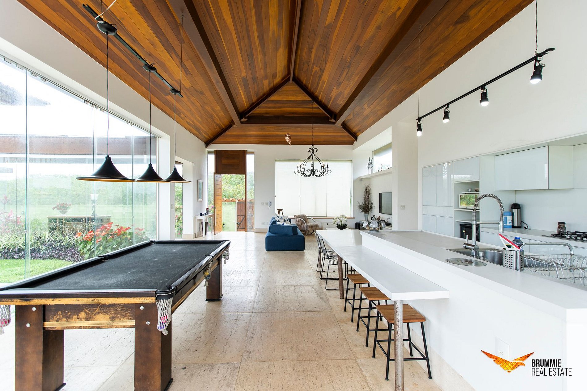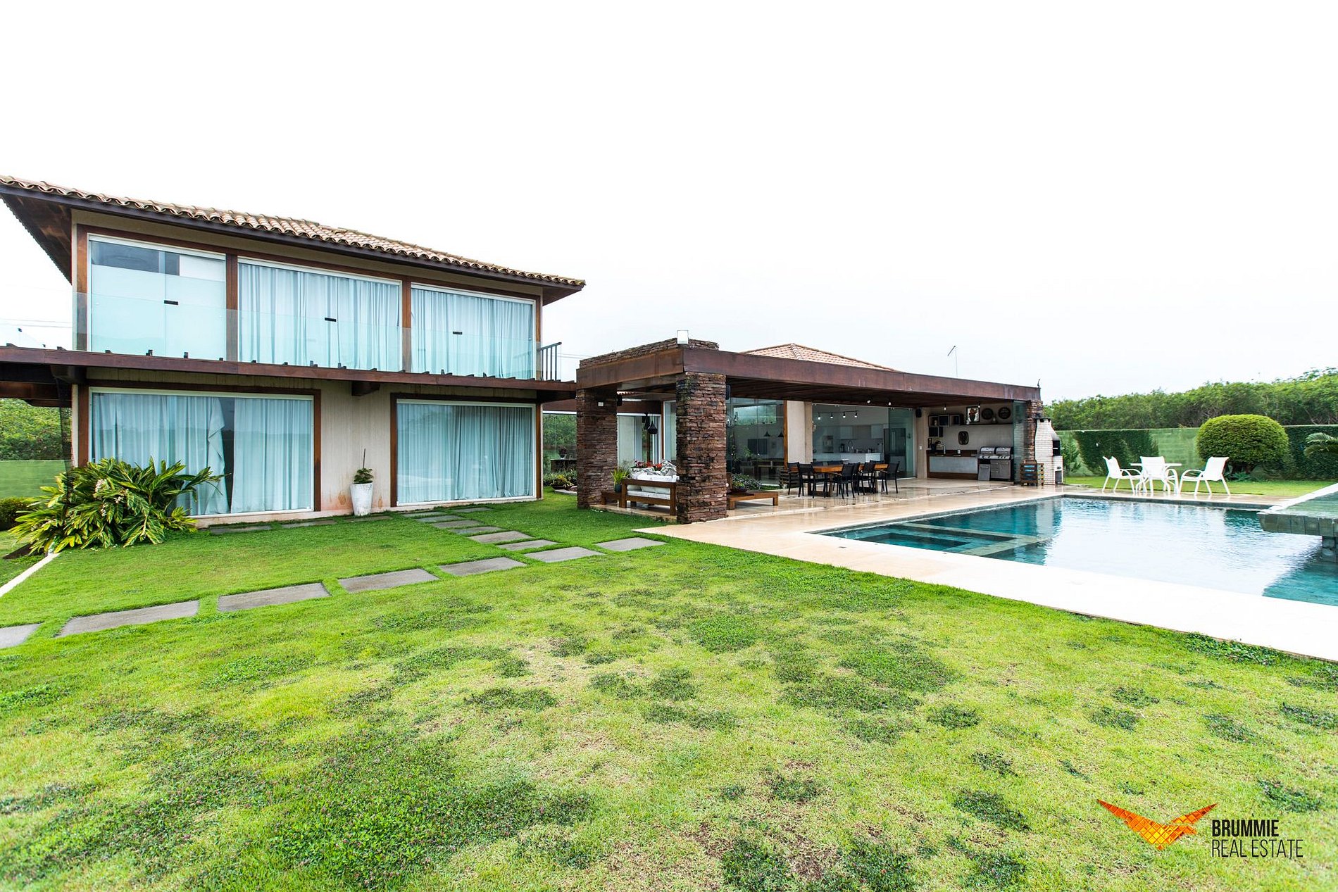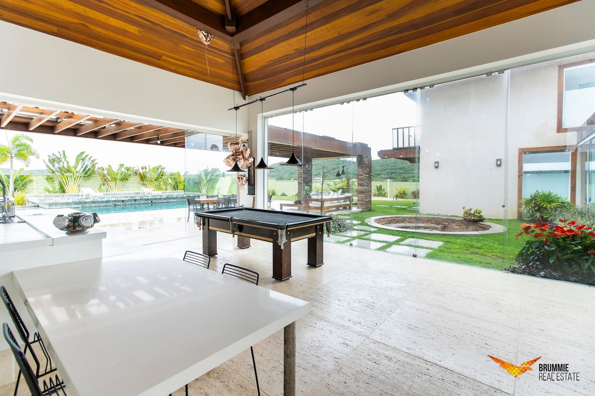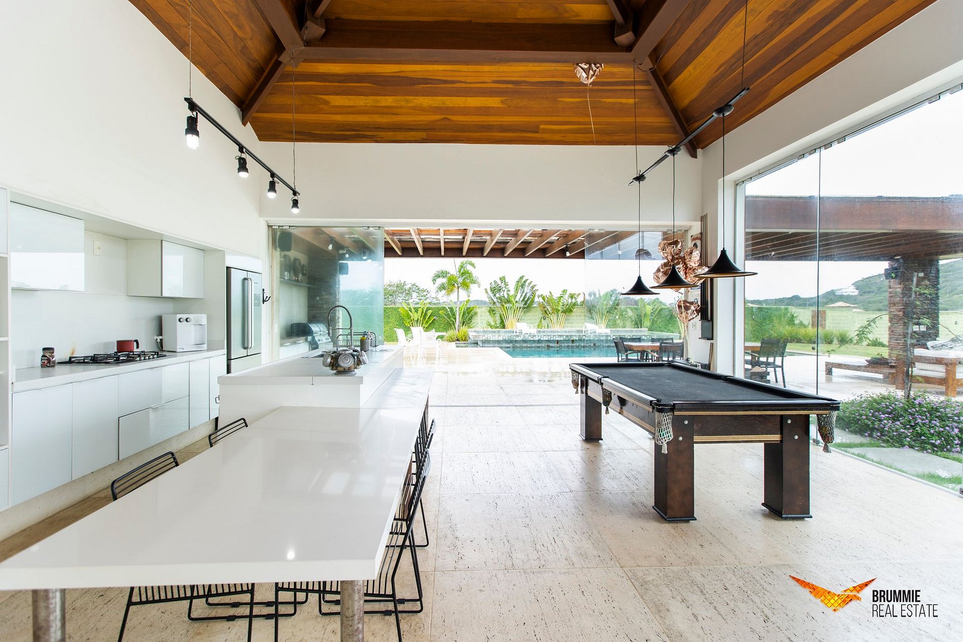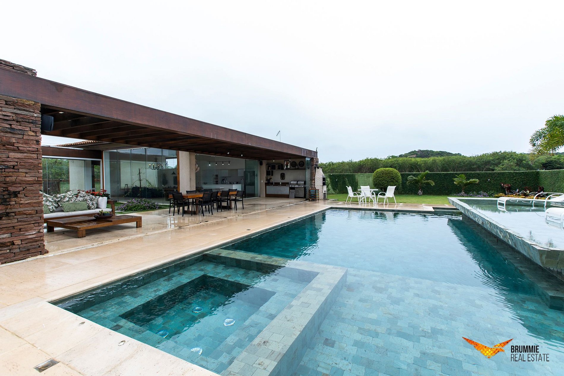 A área externa é um verdadeiro refúgio de lazer e bem-estar, com uma ampla piscina revestida em pedra Hijau, cascata com hidromassagem, elegante área gourmet com churrasqueira a gás, mesa rústica em madeira, um belíssimo gramado ideal para as crianças brincarem, além de uma mesa de sinuca para momentos de descontração entre jovens e adultos.