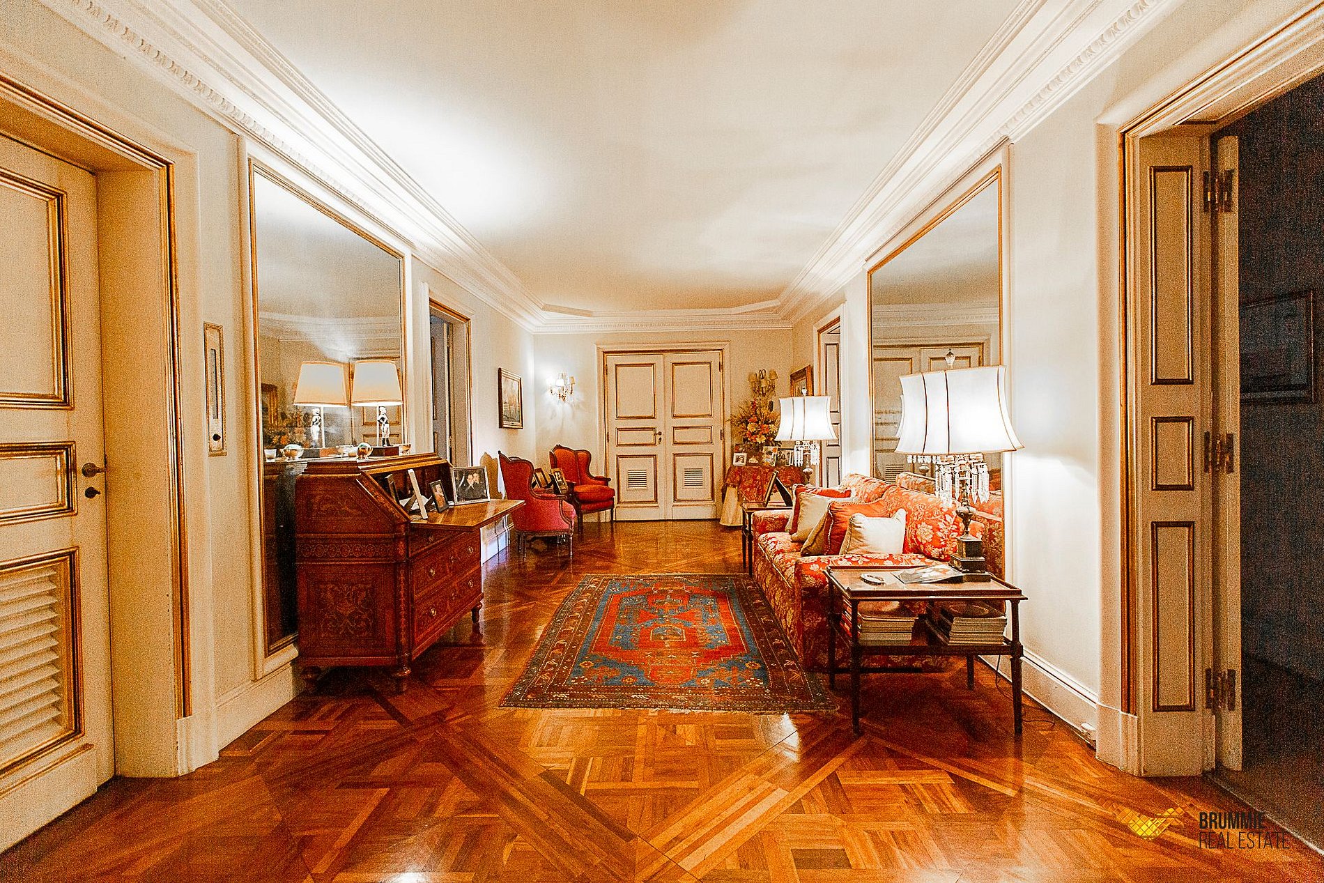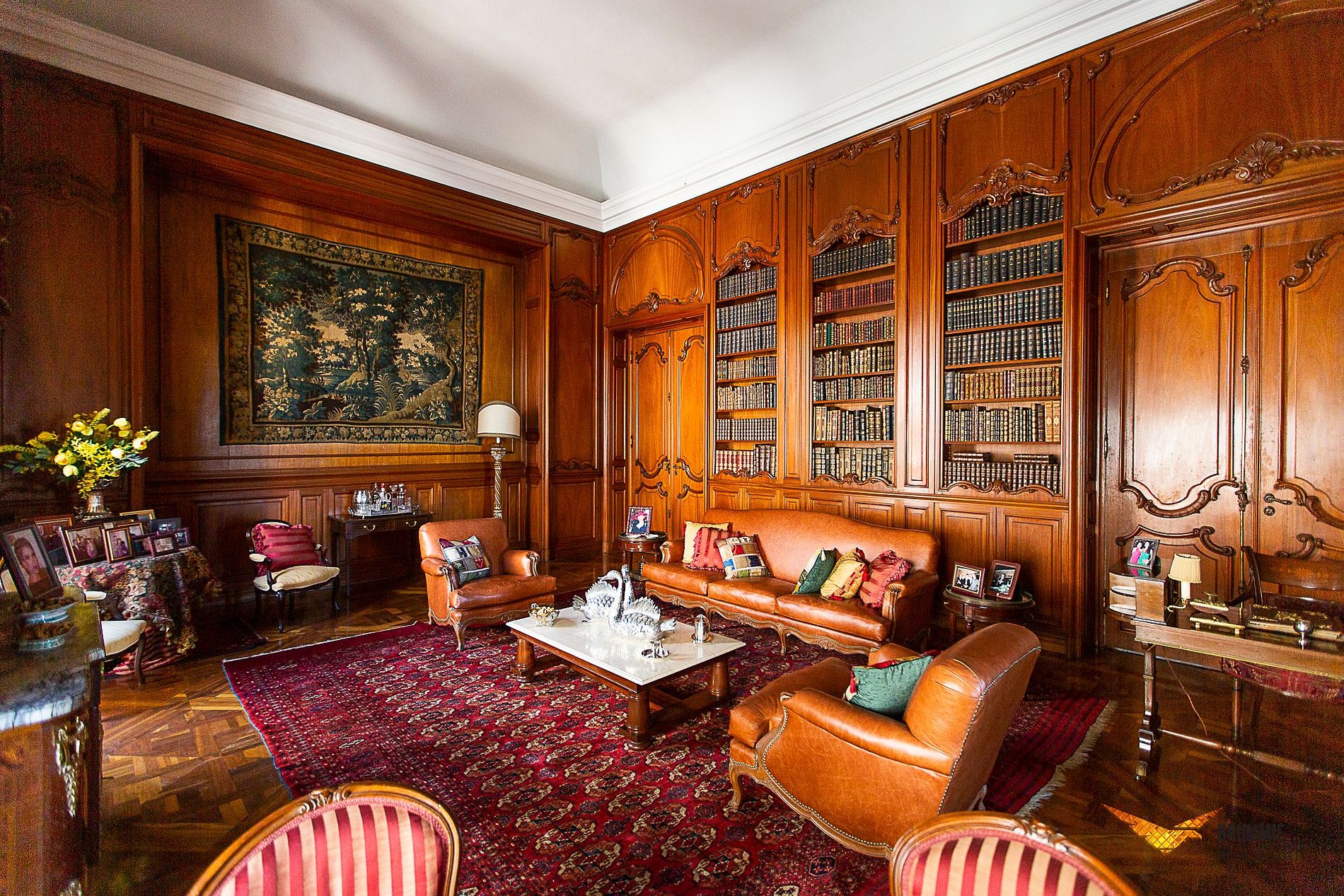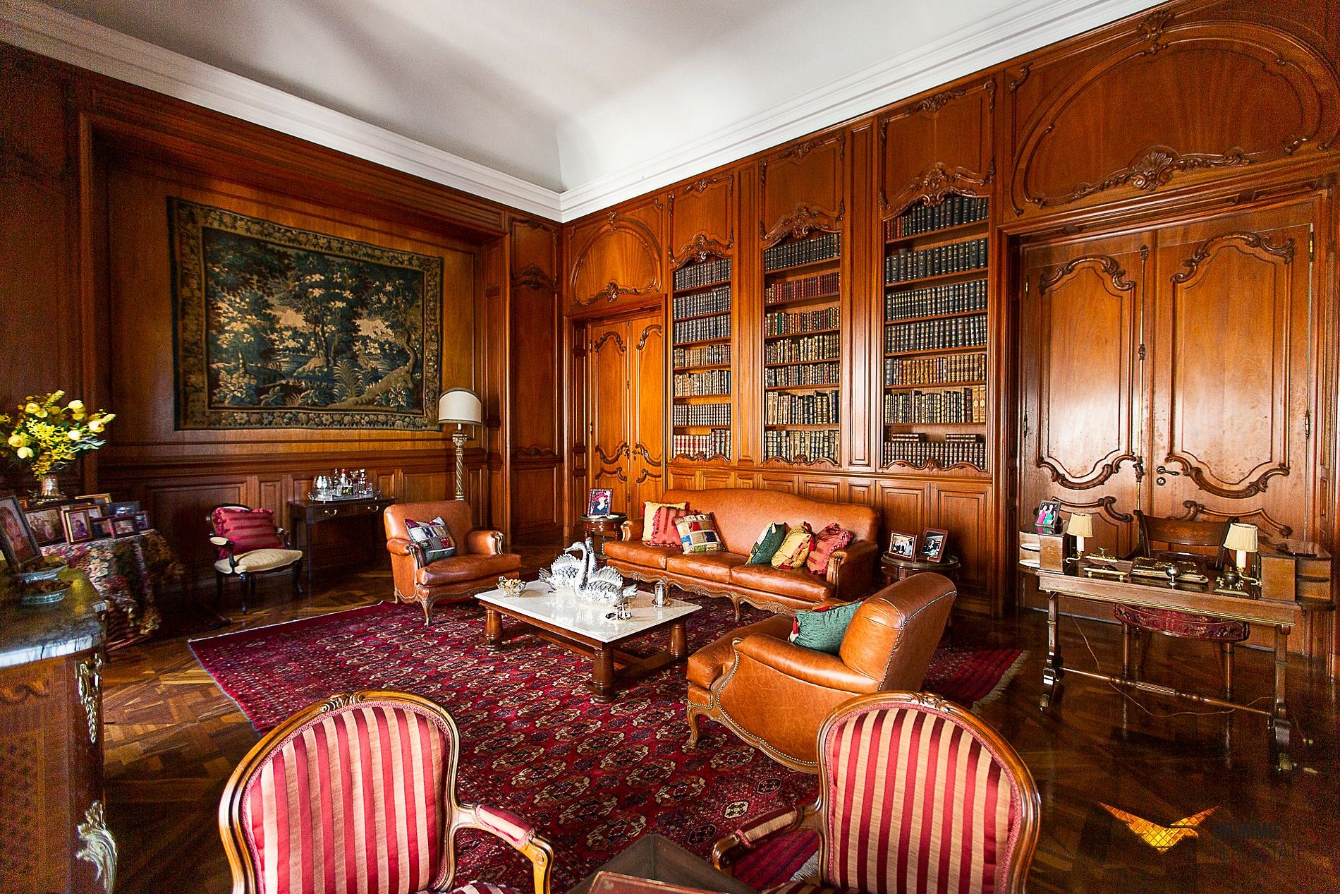 O interior abriga cinco quartos luxuosos e salões interligados por uma imponente escadaria de mármore. A decoração é impecável, com pisos em mármore italiano e espanhol, móveis franceses e italianos e obras de arte que conferem um ar aristocrático e atemporal.