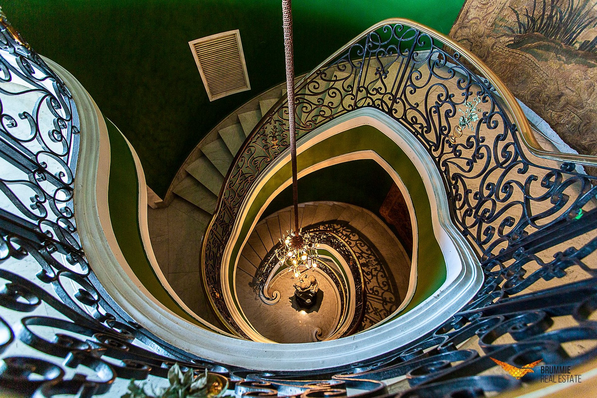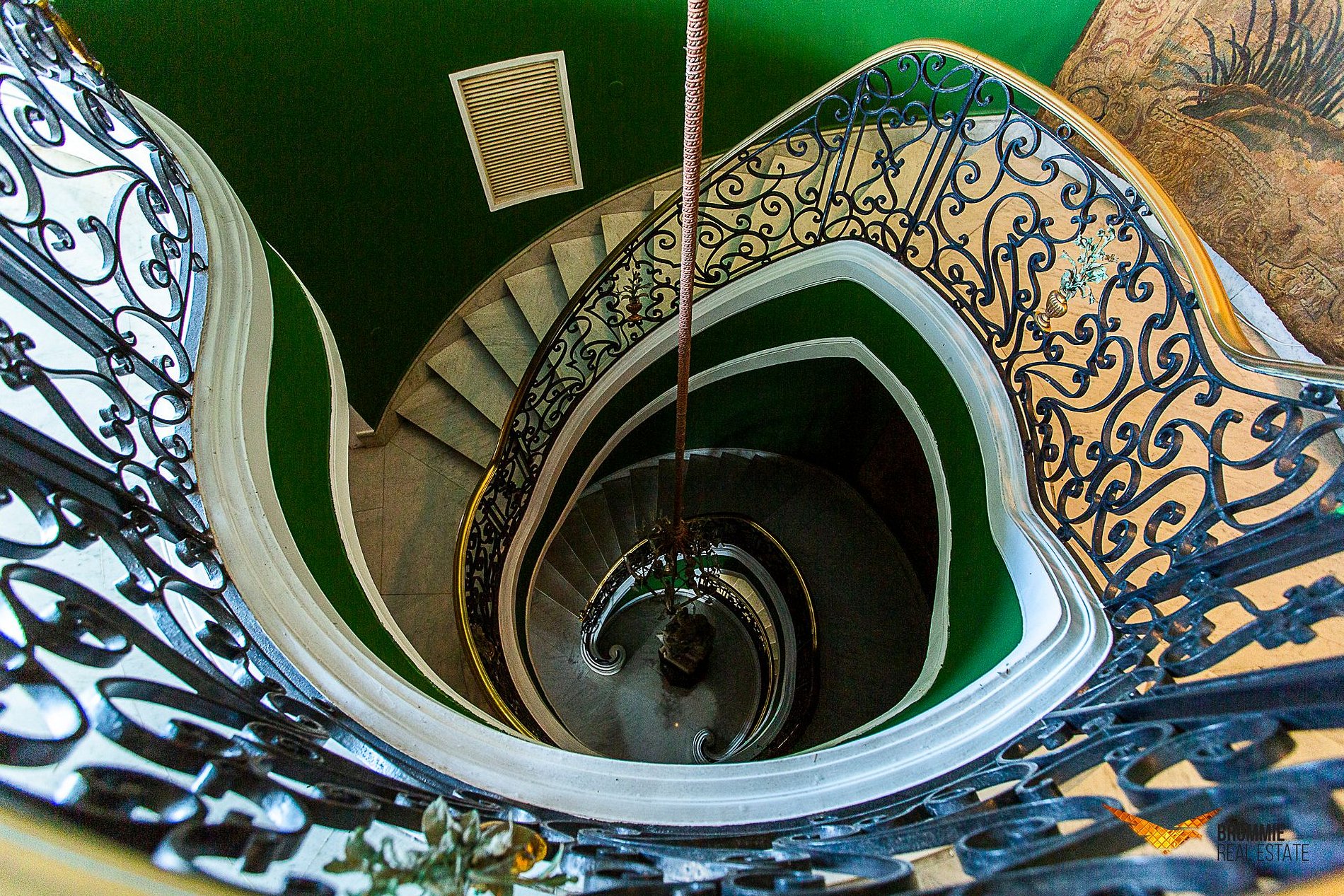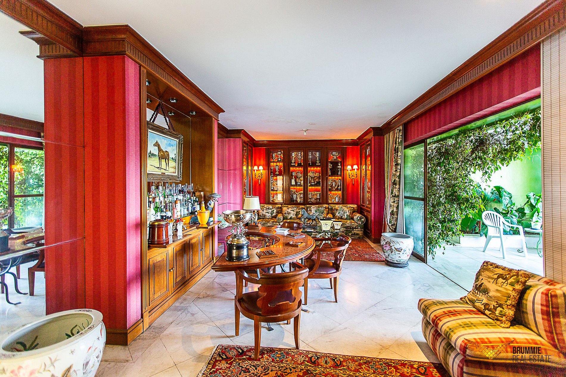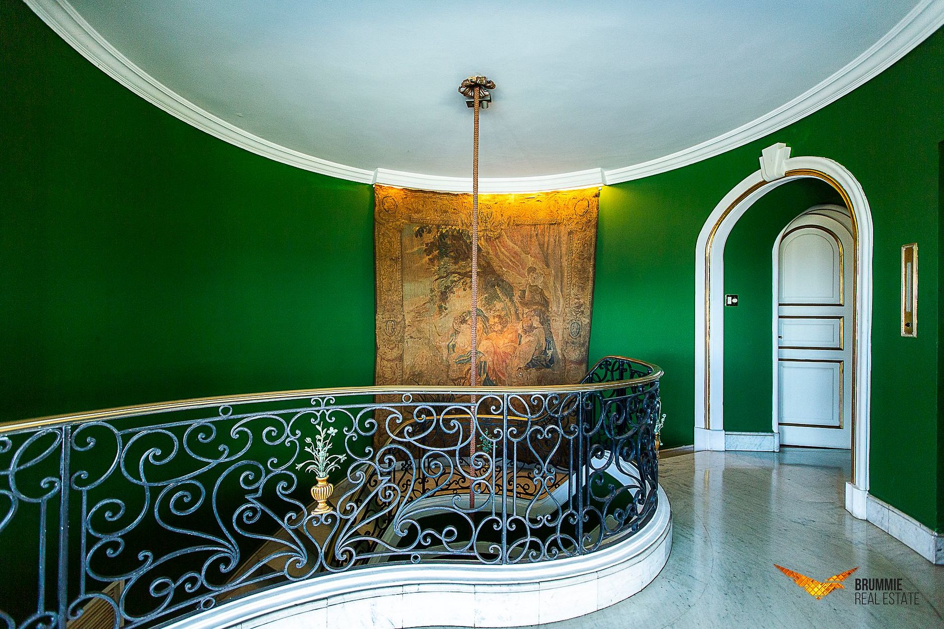 O interior abriga cinco quartos luxuosos e salões interligados por uma imponente escadaria de mármore. A decoração é impecável, com pisos em mármore italiano e espanhol, móveis franceses e italianos e obras de arte que conferem um ar aristocrático e atemporal.