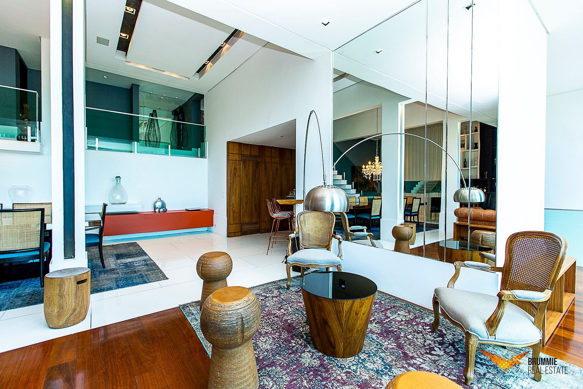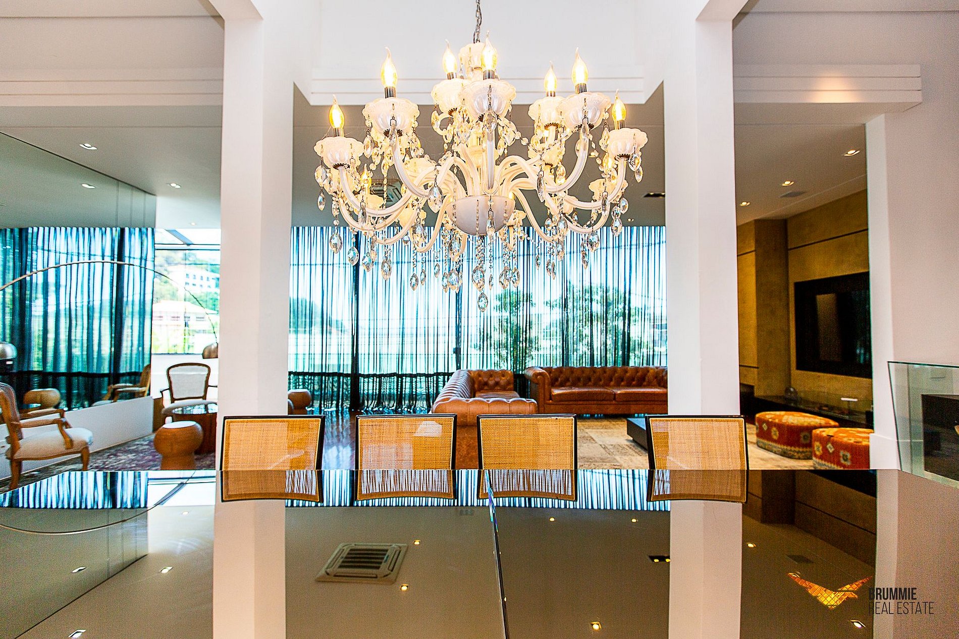 As salas de estar e jantar são generosamente amplas, com tetos altos e design contemporâneo, banhadas por luz natural e integradas ao cenário ao redor. Um elegante bar complementa o ambiente, perfeito para receber convidados com charme. A cozinha é totalmente equipada, e a mansão ainda conta com uma academia privativa com aparelhos profissionais. O elevador dá acesso a todos os andares, garantindo praticidade e conforto.