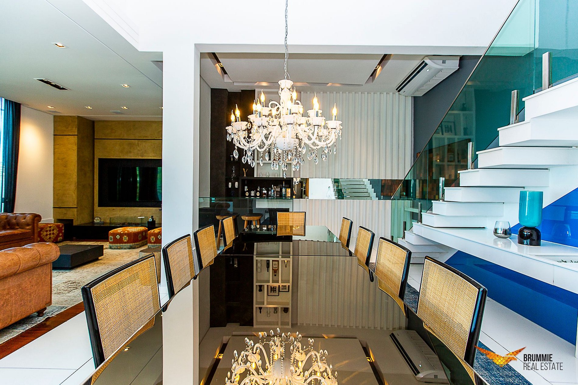 As salas de estar e jantar são generosamente amplas, com tetos altos e design contemporâneo, banhadas por luz natural e integradas ao cenário ao redor. Um elegante bar complementa o ambiente, perfeito para receber convidados com charme. A cozinha é totalmente equipada, e a mansão ainda conta com uma academia privativa com aparelhos profissionais. O elevador dá acesso a todos os andares, garantindo praticidade e conforto.