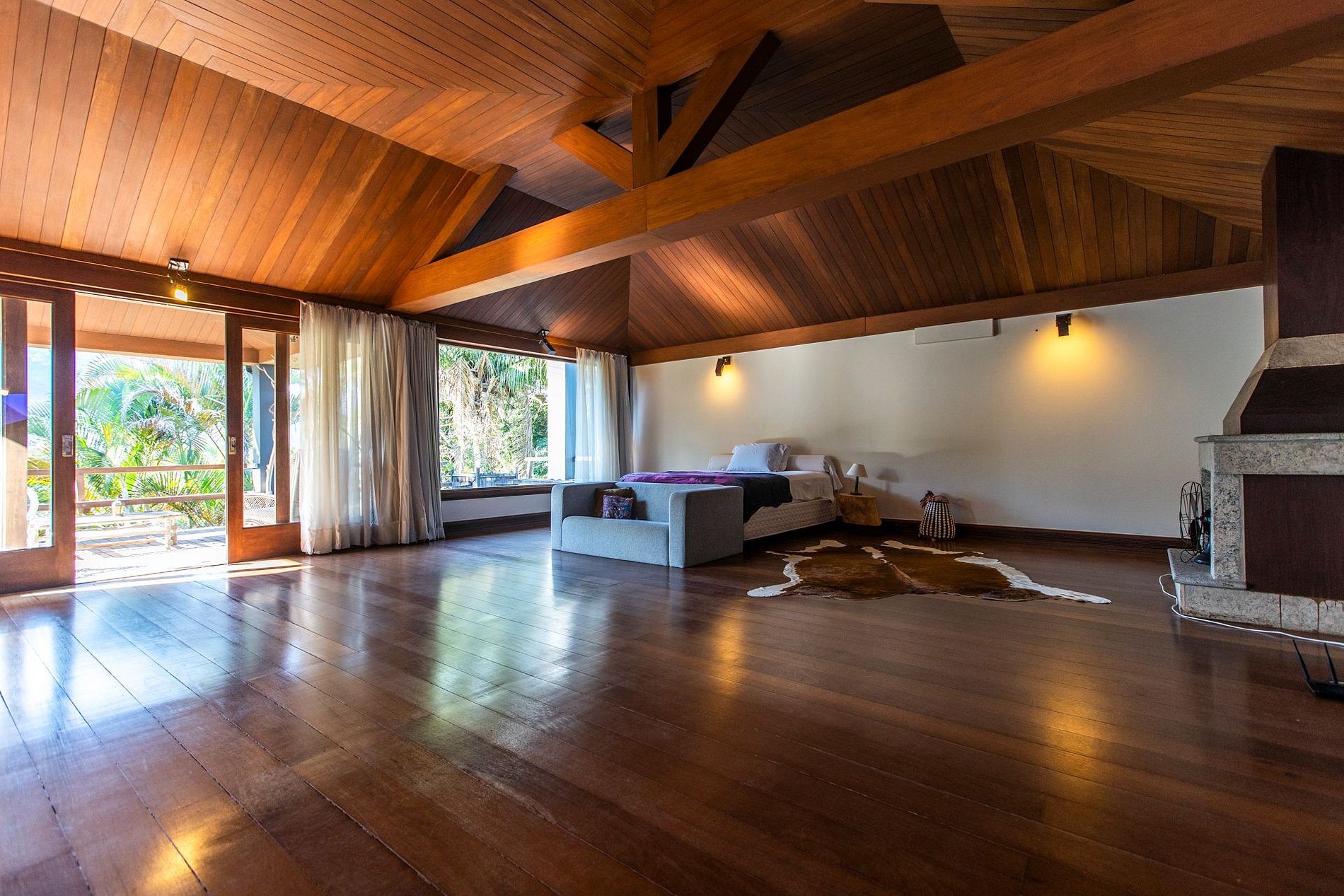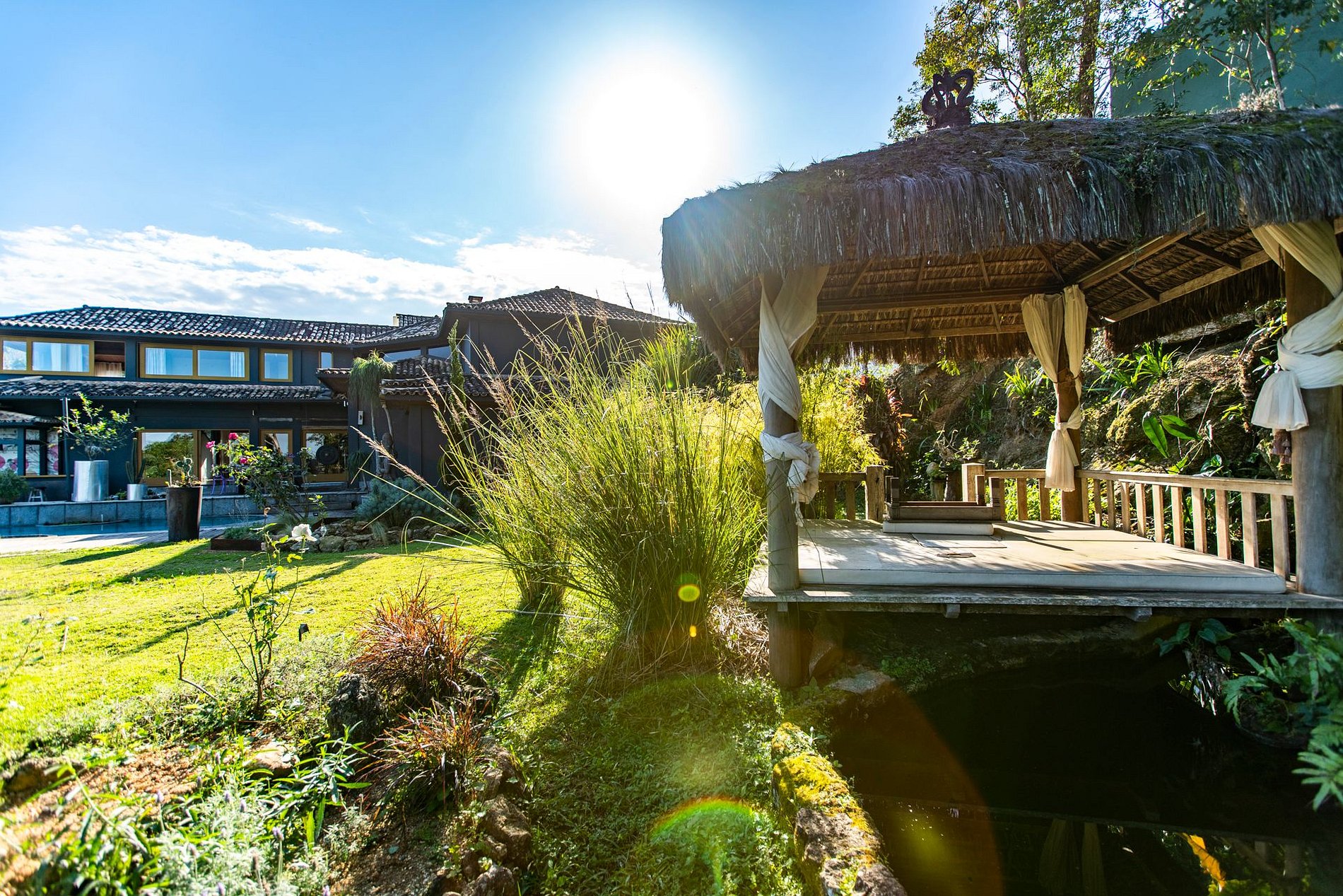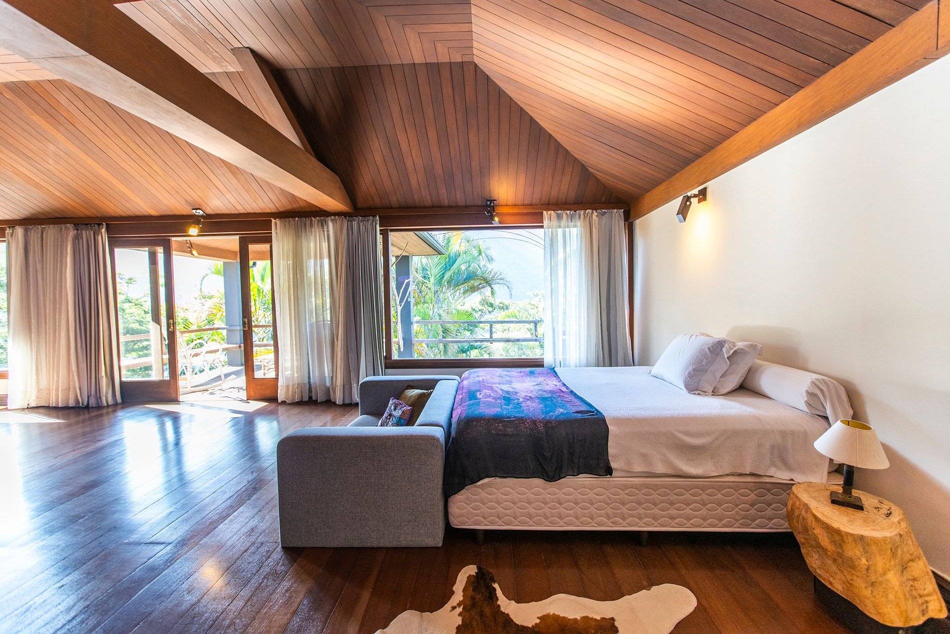 A ampla sala integra conforto e beleza: smart TV, sofás, poltronas e sala de jantar com vista para um jardim exuberante. A casa oferece quatro quartos climatizados — três suítes — incluindo uma suíte master de 90 m² com cama king-size, varanda privativa, sofá e espaço para meditação ou yoga. Os demais quartos contam com camas queen-size.