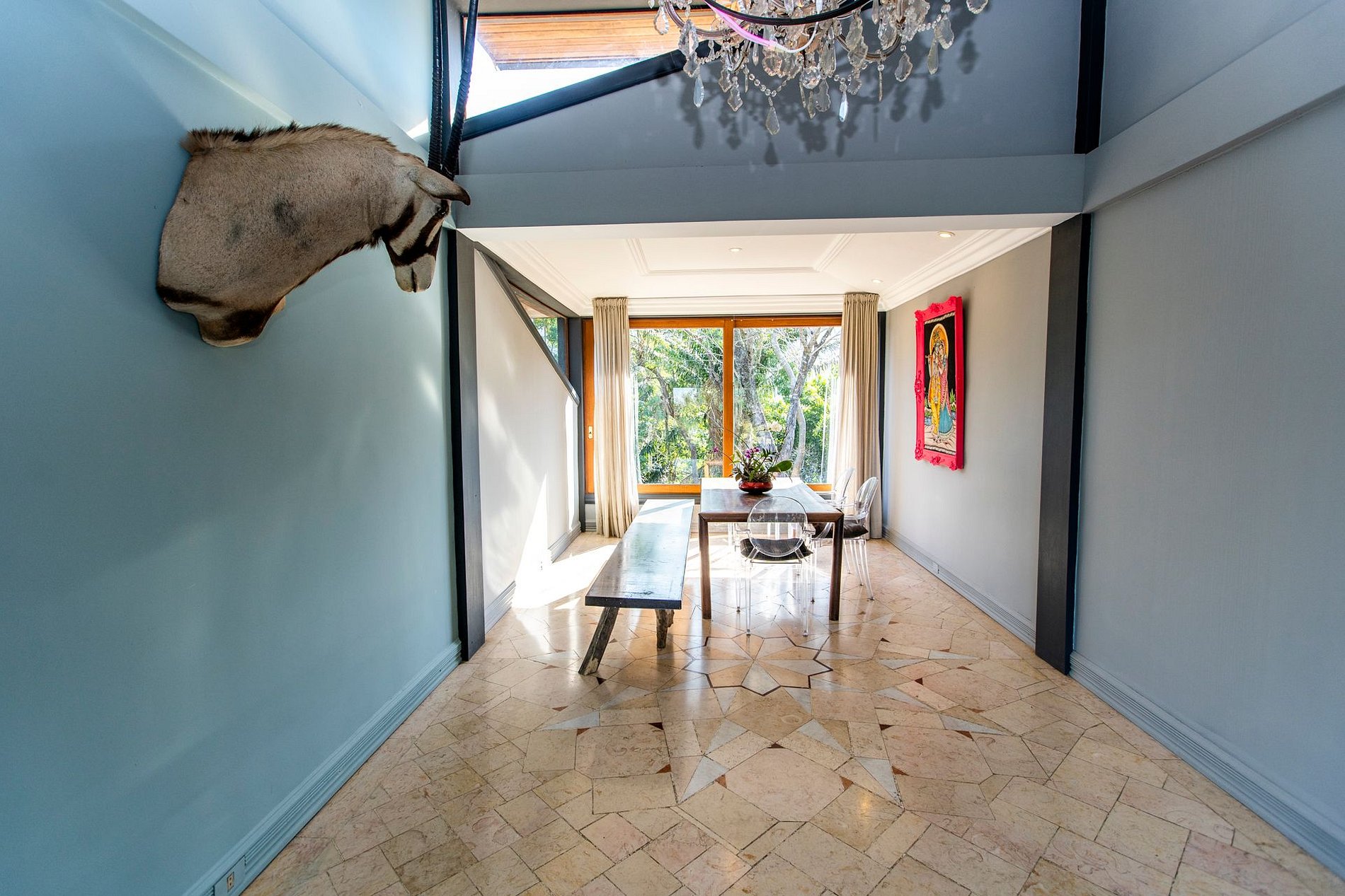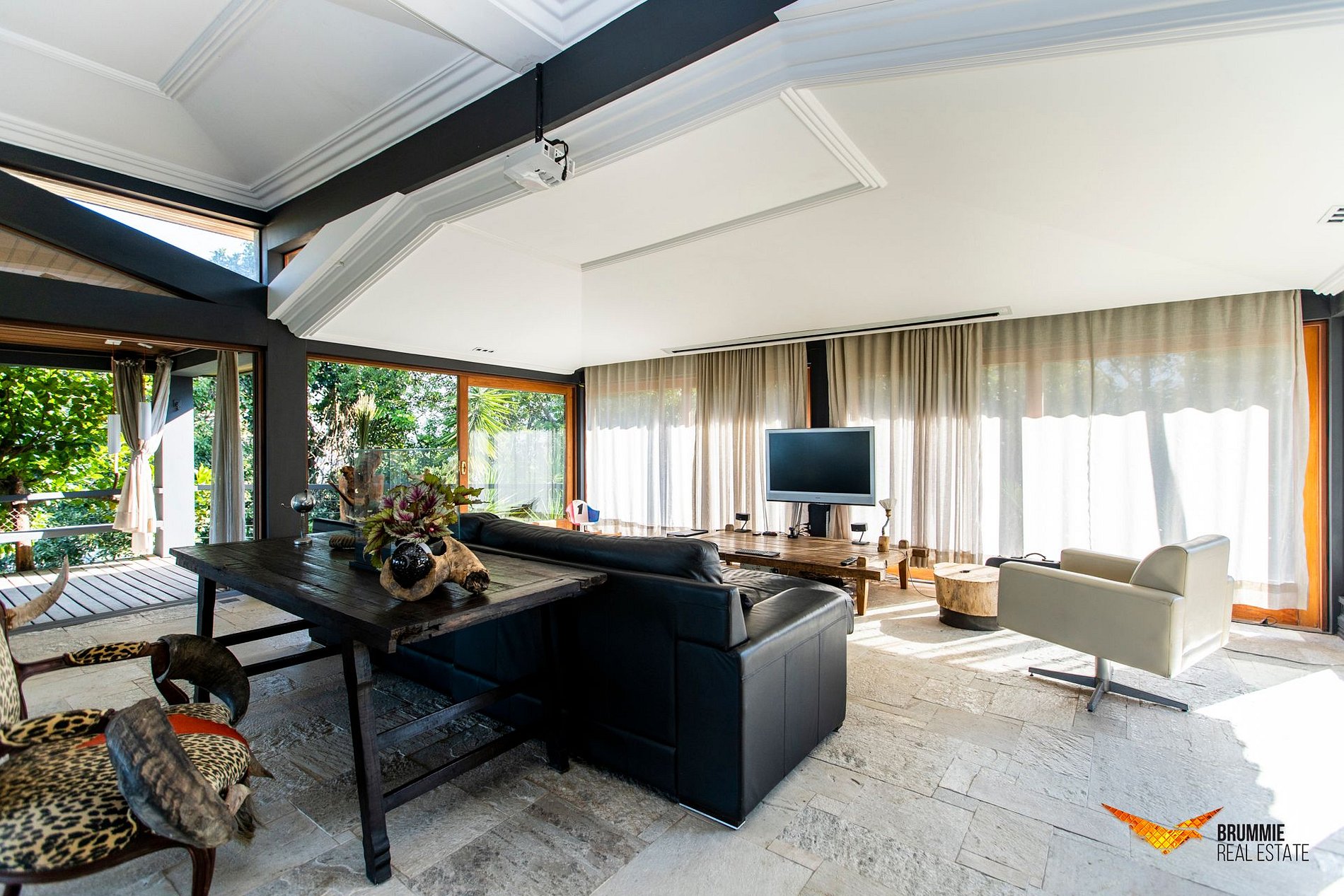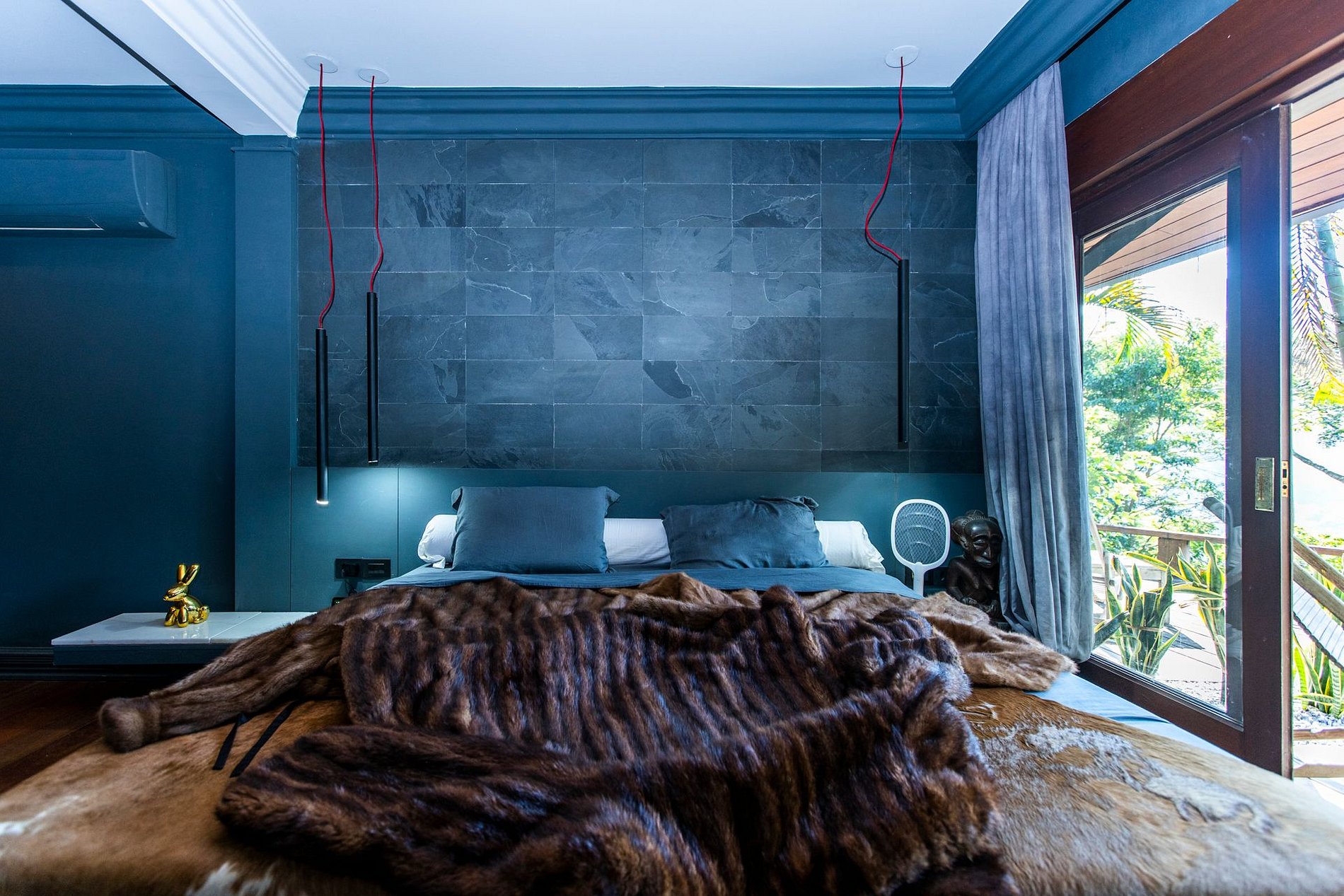 A ampla sala integra conforto e beleza: smart TV, sofás, poltronas e sala de jantar com vista para um jardim exuberante. A casa oferece quatro quartos climatizados — três suítes — incluindo uma suíte master de 90 m² com cama king-size, varanda privativa, sofá e espaço para meditação ou yoga. Os demais quartos contam com camas queen-size.