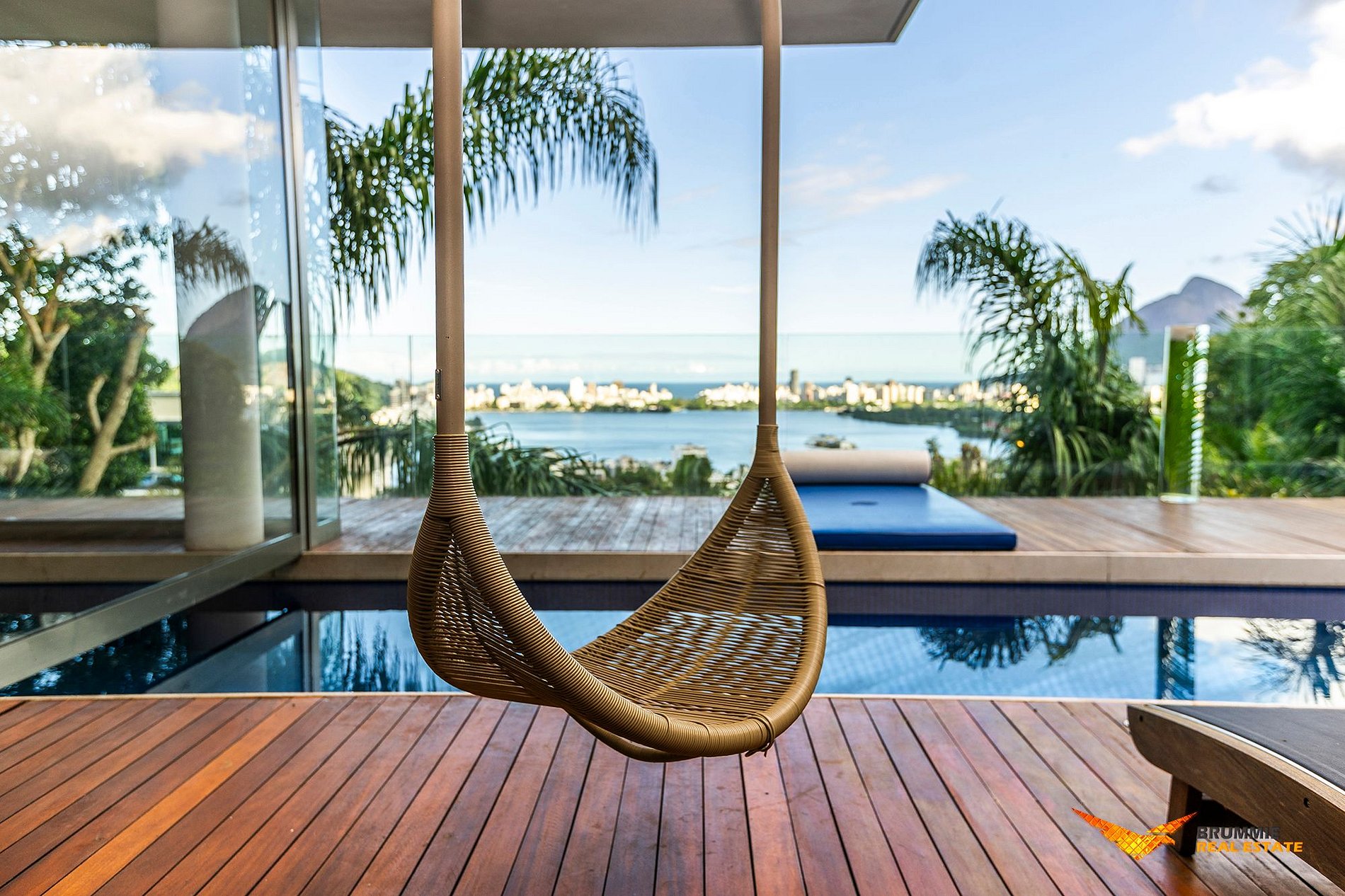 Com estilo eclético e uma arquitetura que valoriza o bem-estar, a casa oferece ambientes amplos e luminosos, destacando-se por sua piscina em formato de L, que sai do interior da casa e atravessa o jardim, criando uma atmosfera cenográfica e relaxante. Ao lado, um deck panorâmico com vista deslumbrante para a Lagoa Rodrigo de Freitas convida a contemplação e momentos inesquecíveis ao ar livre.